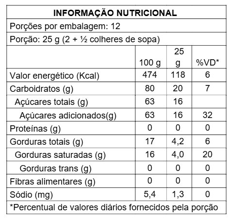 • Não derrete em contato com a umidade, ideal para sobremesas geladas.