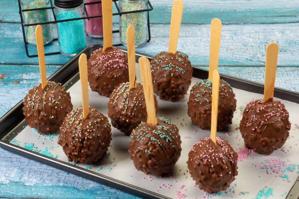 Decoração: Em um recipiente, derreta a Cobertura ao Leite em banho-maria ou micro-ondas. Coloque em uma manga de confeitar, faça risquinhos nas maçãs e decore com as Miçangas Coloridas Baby e as Miçangas Rosa e Azul Baby.