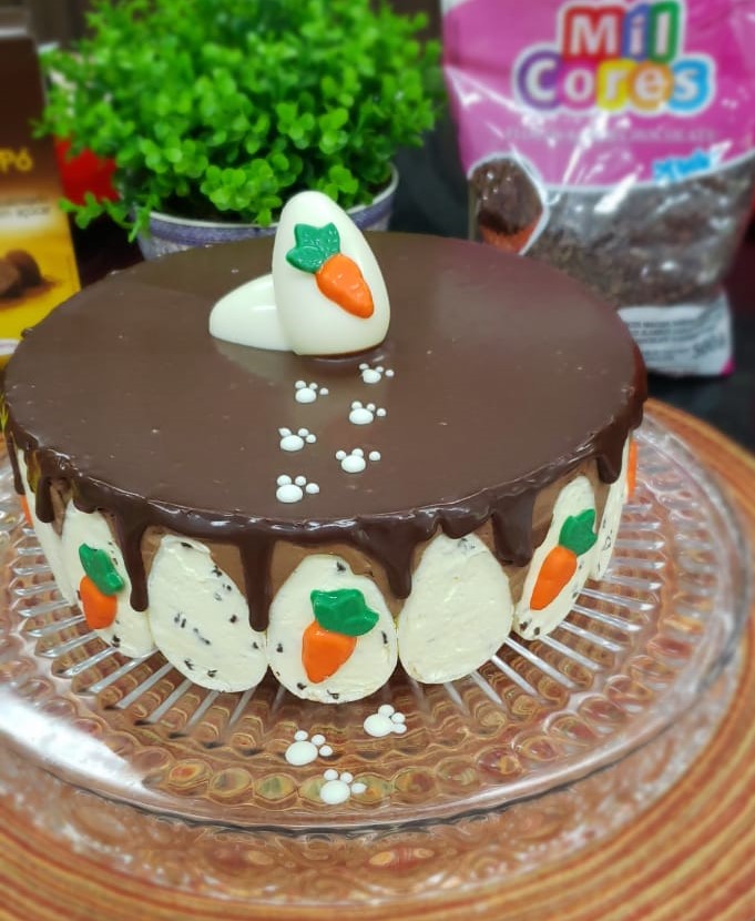 Em um aro de 20 cm de diâmetro untado, coloque uma base de bolo de 16 cm de diâmetro, acomode os ovinhos recheados na lateral do aro. Espalhe a mousse de chocolate e em seguida, o restante da mousse de maracujá. Coloque outra base do bolo, finalize com o restante da mousse de chocolate e leve para gelar por aproximadamente 60 minutos. Retire da geladeira, finalize com a ganache e decore com ovinhos e cenoura de chocolate.