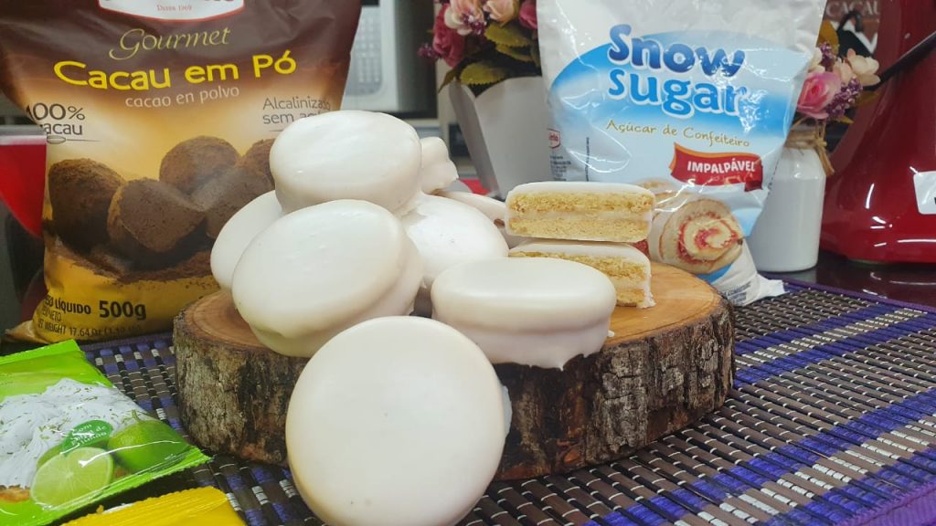 Cobertura: Em uma panela, coloque as claras, o açúcar refinado e leve ao fogo até atingir 65 °C. Em seguida, bata na batedeira até montar. Por último, acrescente o Aroma de Baunilha Branca, misture e deixe descansar por 1 hora. Após o descanso, mexa até ficar líquido, banhe o Alfajor e deixe secar por 24 horas.