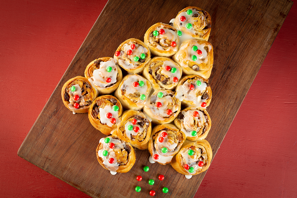Montagem: Com o auxílio de um rolo, abra a massa e espalhe o creme de manteiga, as nozes, a uva passa branca e as Gotas de Chocolate. Enrole a massa em formato de rocambole e corte rolinhos de 3 cm. Unte uma assadeira baixa e monte uma árvore. Deixe crescer e asse em forno preaquecido a 180 °C, por aproximadamente 30 minutos.