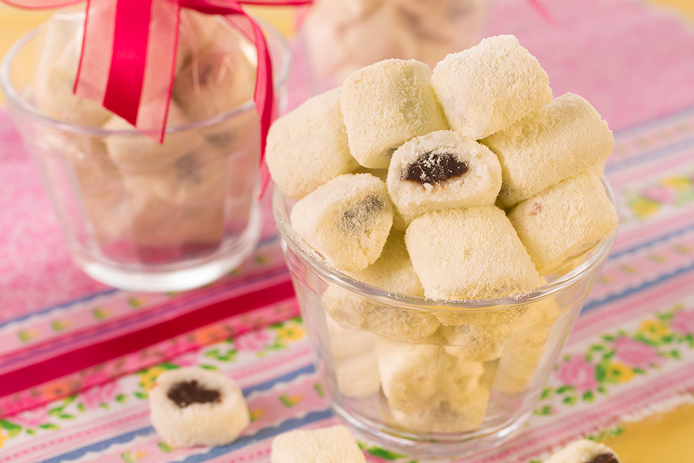 Massa: Em um recipiente, coloque o Açúcar de Confeiteiro, o amido de milho e o coco ralado, misture e aos poucos coloque o leite de coco misturando até soltar das mãos. Reserve.