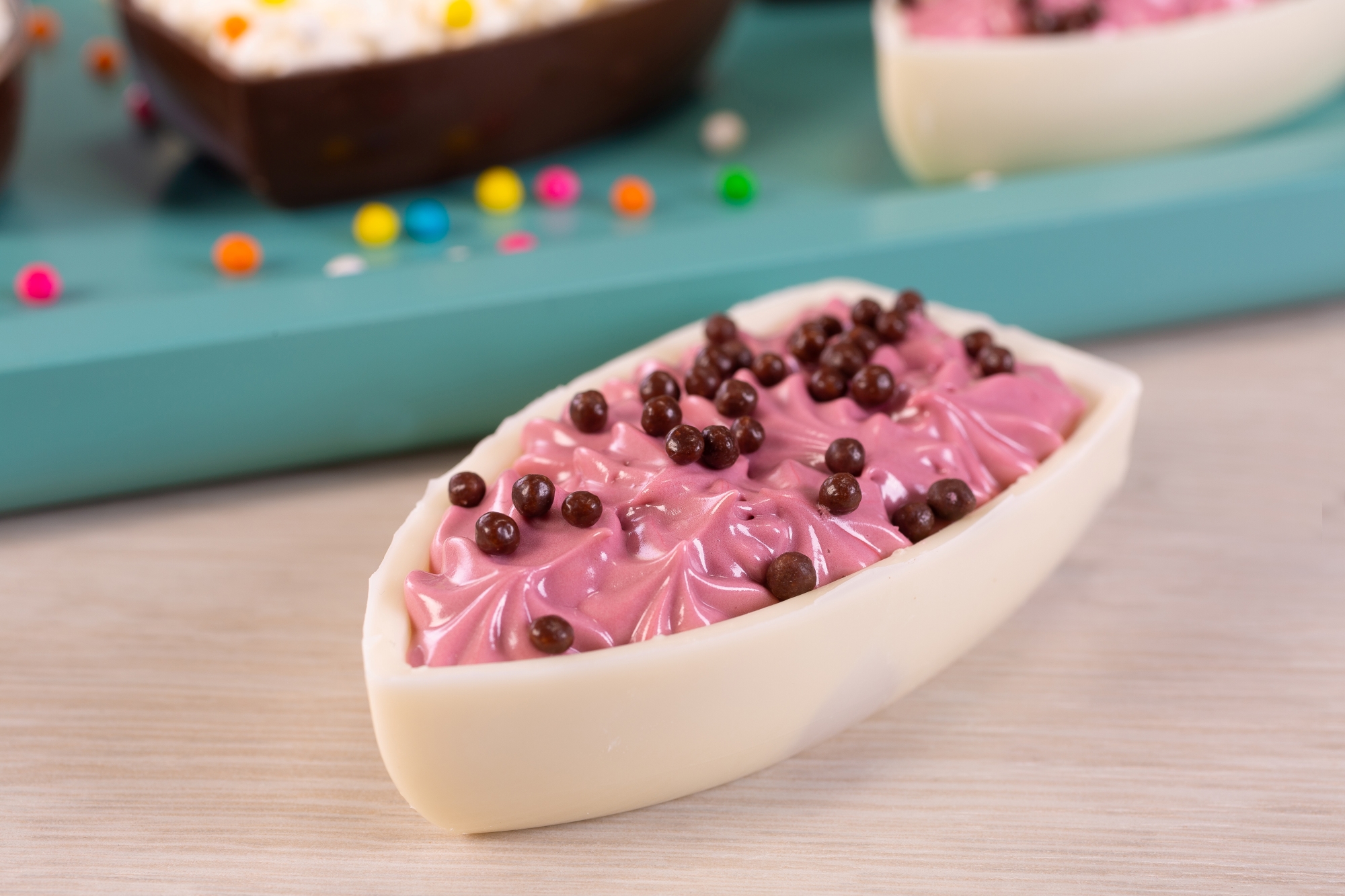 Decoração: Coloque o recheio de frutas vermelhas em uma manga de confeitar com bico pitanga pequeno, preencha a barquinha Branca, decore com Choco Power Ball Sabor Chocolate e reserve. Coloque o recheio de limão em uma manga de confeitar com bico pitanga pequeno, preencha a barquinha ao Leite e decore com o Choco Power Ball Colorido.