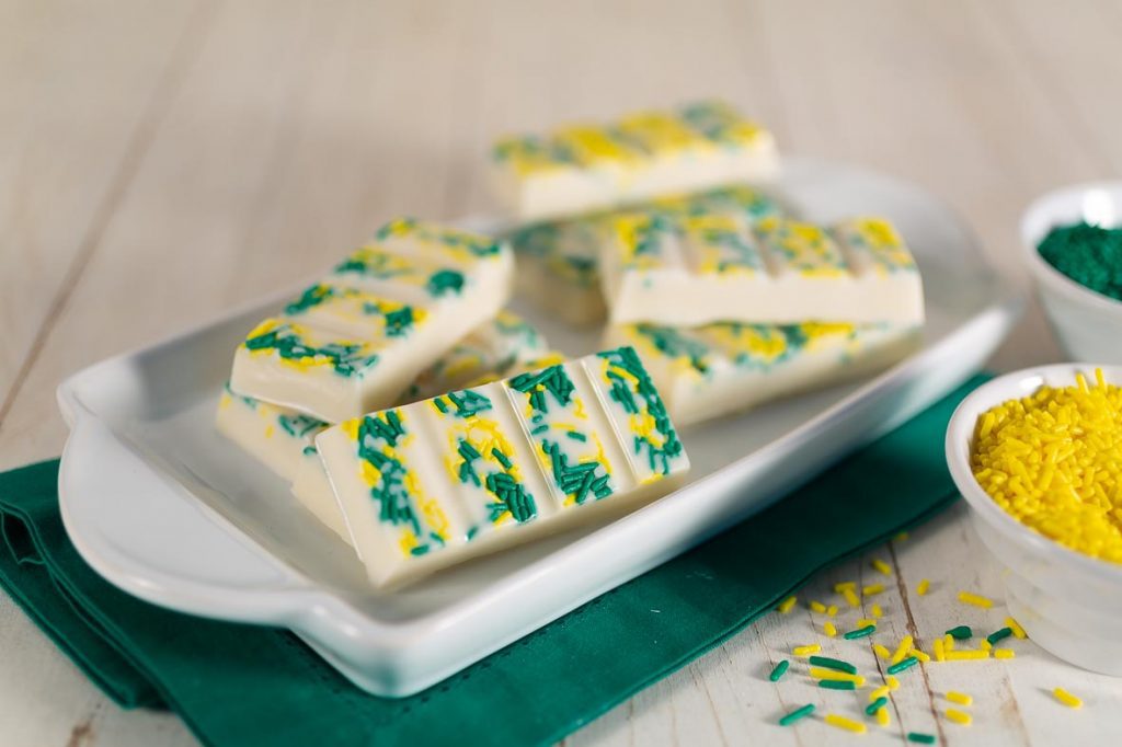 Casquinha e Decoração: Em um recipiente derreta a Cobertura Branca em banho-maria ou micro-ondas. Reserve. Coloque Granulado Amarelo e Verde nas forminhas de acetato em formato de barrinha e em seguida coloque a Cobertura derretida. Deixe por alguns minutos até começar a secar e vire para tirar o excesso de Cobertura. Coloque o recheio trufado de limão em uma manga de confeitar e recheie as barrinhas, por último espalhe a Cobertura derretida e leve à geladeira até ficar opaca.