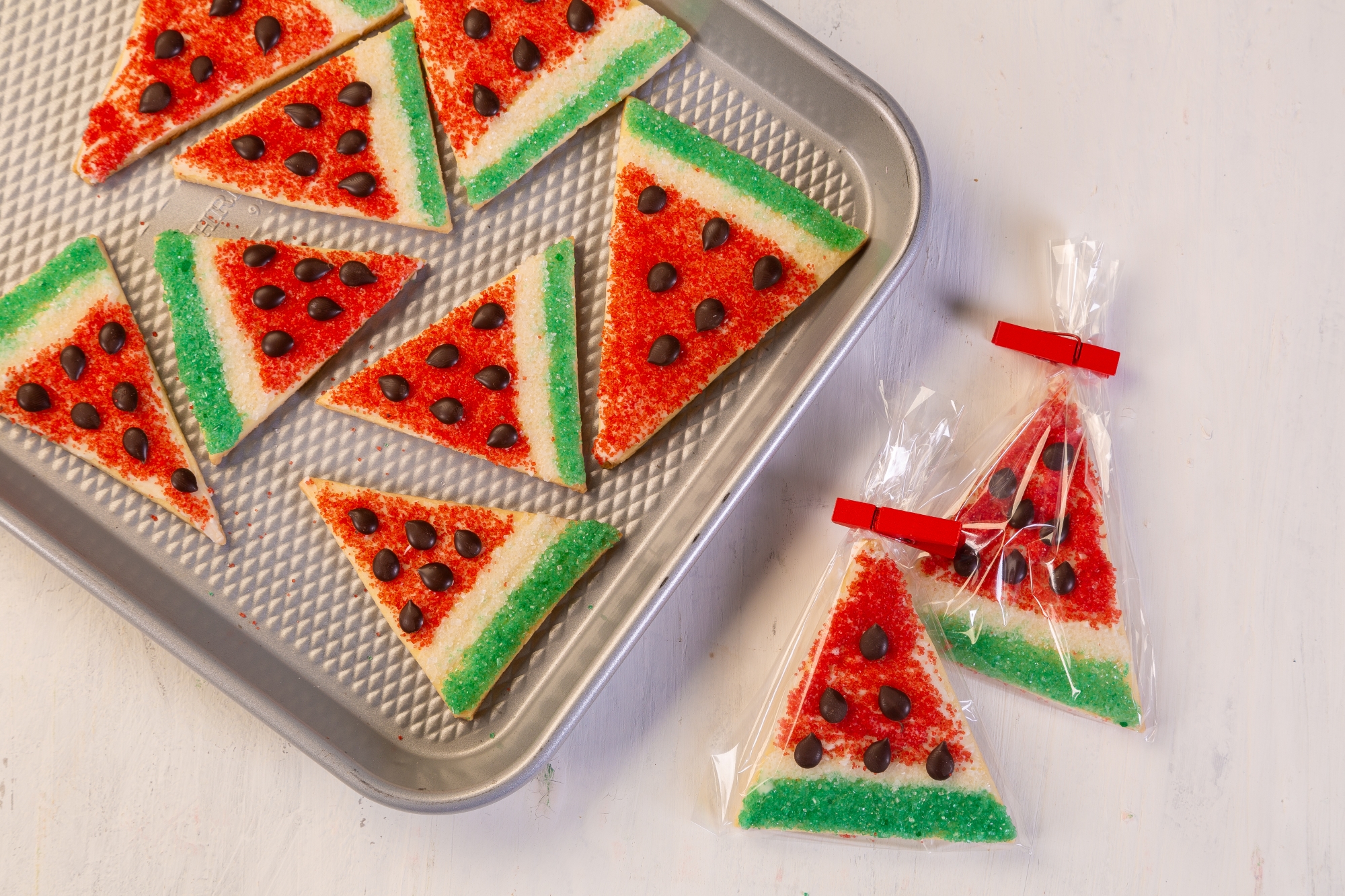 Em um recipiente, derreta a Cobertura Branca em banho-maria ou micro-ondas. Coloque em um saco de confeitar, espalhe uma tira no biscoito e passe no Açúcar Verde. Espalhe a Cobertura derretida do lado do Açúcar Verde e passe o Açúcar Branco. Em seguida espalhe a Cobertura derretida no restante do biscoito e espalhe o Açúcar Vermelho. Para fazer o detalhe da semente, coloque a Cobertura Amarga em um recipiente e derreta em banho-maria ou micro-ondas, coloque em um saco de confeitar e pressione sobre o Açúcar Vermelho, deixe secar.