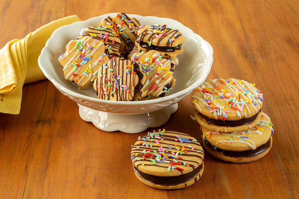 Recheie as bolachinhas com o brigadeiro já frio e faça risquinhos com as Coberturas Meio Amarga e Branca derretidas em banho-maria ou micro-ondas. Finalize com o Granulado Colorido.