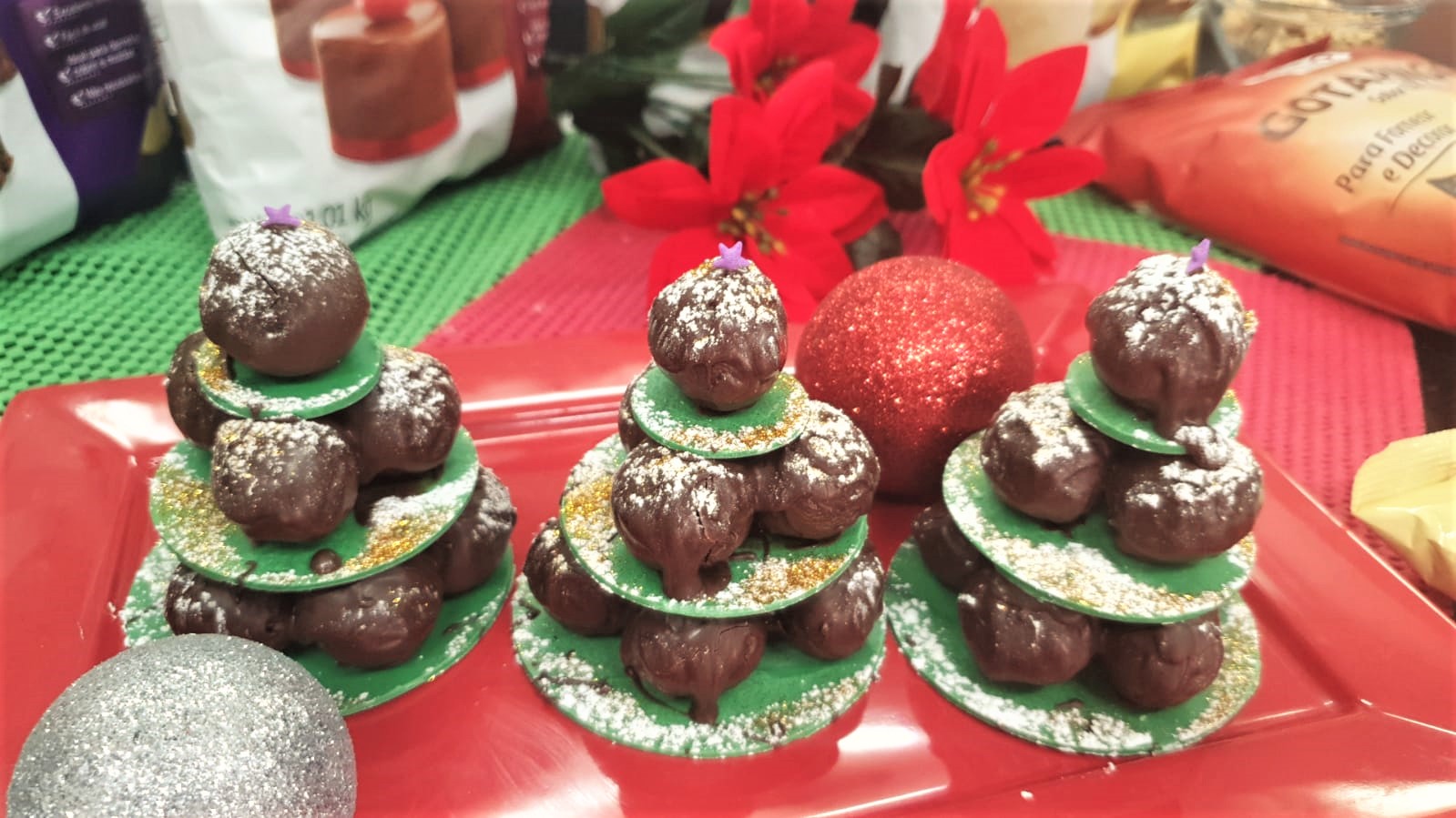 Para a Árvore: Em um recipiente derreta a Cobertura Branca em banho-maria ou micro-ondas. Acrescente o corante próprio para chocolate na cor verde e misture até ficar na cor desejada. Em seguida espalhe sobre uma folha de papel-manteiga, espere começar a secar e corte com cortador redondo de vários tamanhos, reserve. Em um recipiente derreta a Cobertura Amarga em banho-maria ou micro-ondas. Em seguida banhe as trufas e monte a árvore.