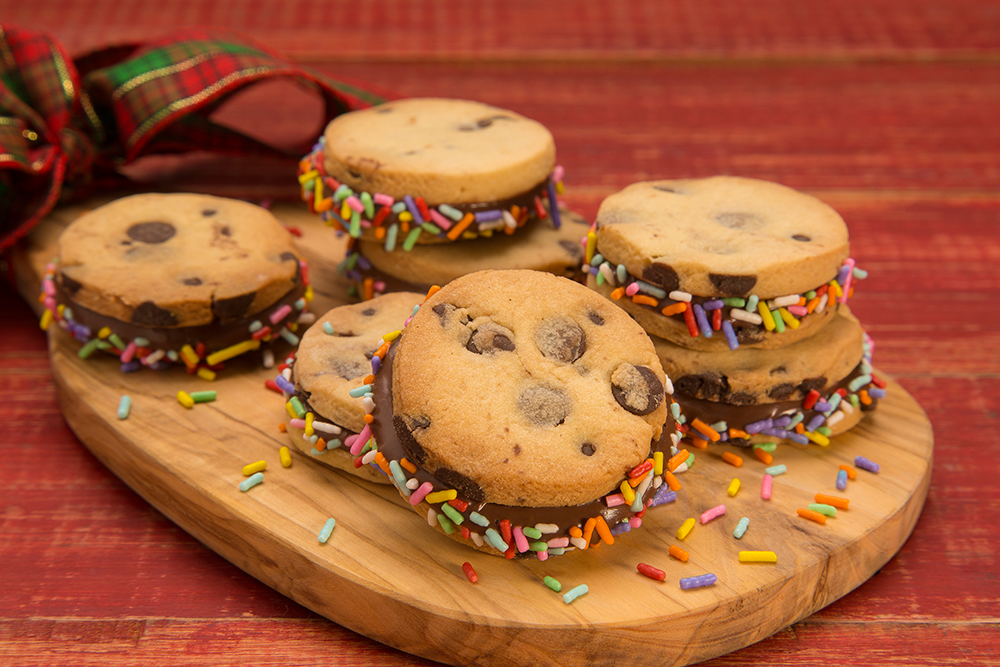 Montagem e Decoração: Recheie as bolachas com o recheio forneável, feche e passe no Granulado Colorido.