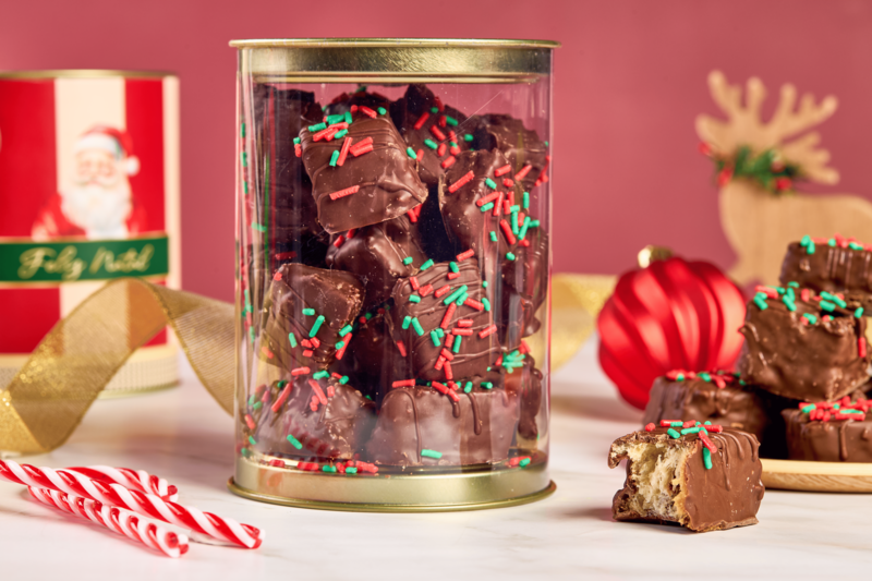 Corte o panetone em cubinhos, reserve, em um recipiente derreta a cobertura meio amarga, banhe os cubinhos na cobertura, espere cristalizar, faça risquinhos com a cobertura derretida e decore com granulados nas cores verde e vermelho.