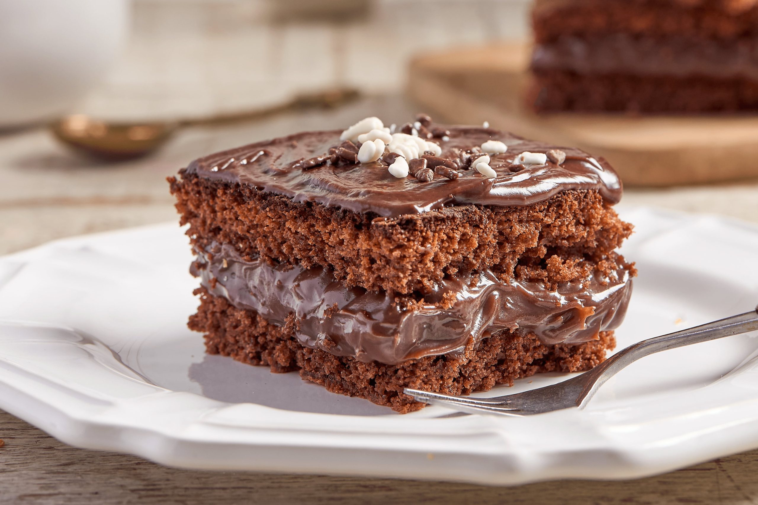 Coloque o recheio na manga de confeitar, corte a massa ao meio, coloque o recheio e cubra com a outra parte da massa. Cubra o bolo todo com a ganache e decore com o flocos.