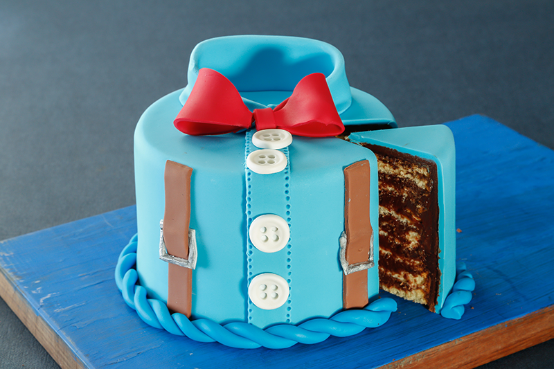 Forre uma assadeira com plástico e intercale camadas finas da massa com o recheio trufado. Leve à geladeira prensado por 6 horas. Retire o bolo da geladeira, deixe sair o gelo por 1 hora e desenforme da assadeira. Espalhe a blindagem no bolo e com o auxílio de uma espátula alise bem. Sove a Pasta Americana, tinja com corante em gel azul, abra com o auxílio de um rolo, cubra o bolo e modele a gola da camisa. Abra a Pasta Americana tingida de azul com o auxílio de um rolo, corte uma tira e cole com um pouco de água no centro do bolo, faça pontinhos e modele botões, cole na tira. Tinja a Pasta Americana com corante em gel vermelho, modele uma gravata borboleta e cole na gola com um pouco de água. Tinja a Pasta Americana com corante em gel marrom, abra com auxílio de um rolo e corte duas tiras. Reserve. Abra a Pasta Americana branca com o auxílio de um rolo, corte dois quadrados pequenos e recorte o centro para ficar um quadrado vazado. Passe a tira marrom por dentro e cole no bolo com um pouco de água. Tinja a Pasta Americana com corante em gel azul deixando mais escuro, modele duas tiras e enrole, coloque em volta do bolo.