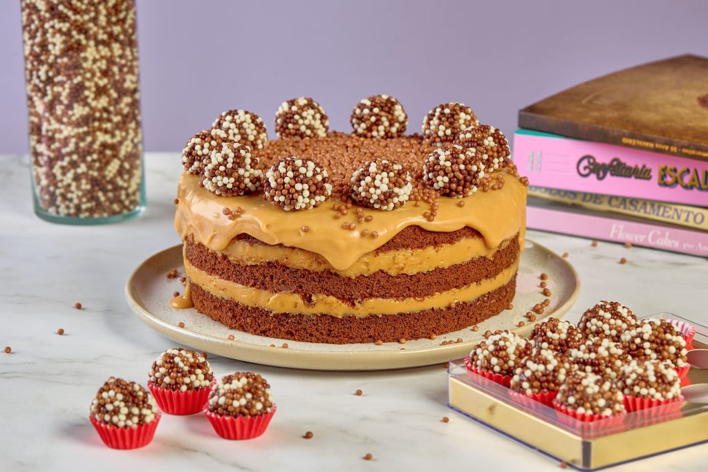 Corte a massa em três partes, forre uma assadeira com plástico e intercale fatias de bolo, com o brigadeiro de caramelo, em seguida desenforme o bolo, cubra em cima do bolo com o brigadeiro de caramelo em ponto cremoso deixando escorrer nas laterais, decore com brigadeiros e choco power ball caramelo.