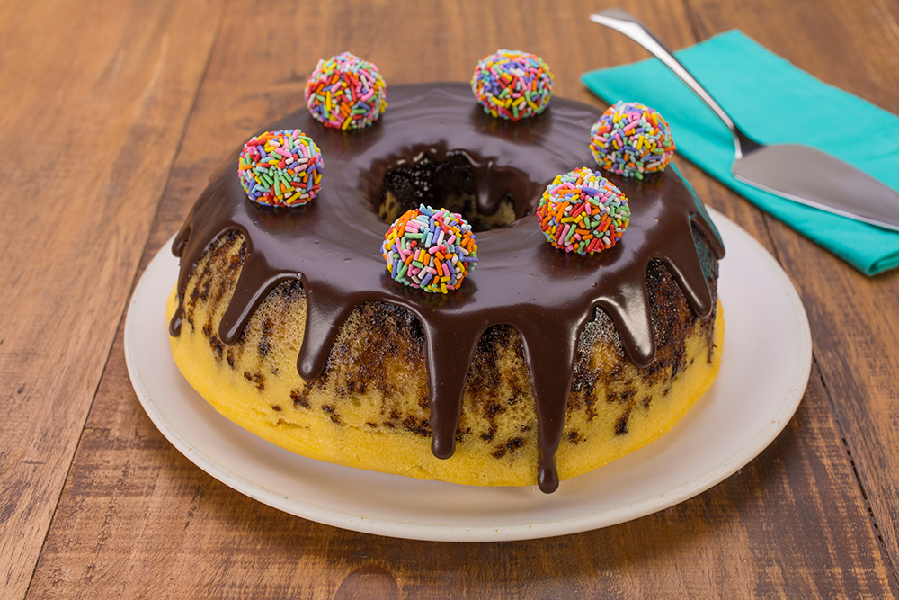 Cobertura: Em um recipiente, derreta a Cobertura Meio Amarga em banho-maria ou micro-ondas. Acrescente o creme de leite e o conhaque e mexa até obter um creme liso e brilhante. Espalhe sobre o bolo deixando escorrer nas laterais e para finalizar decore com os brigadeiros.