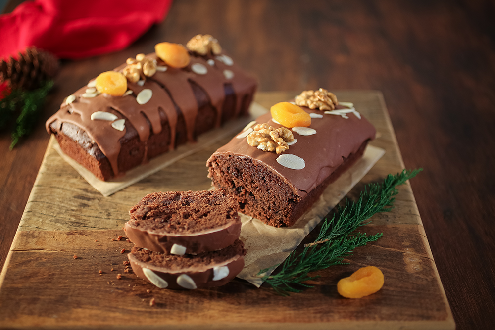Decoração: Desenforme o bolo e espalhe a cobertura, decorando com nozes, amêndoas laminadas e damascos.