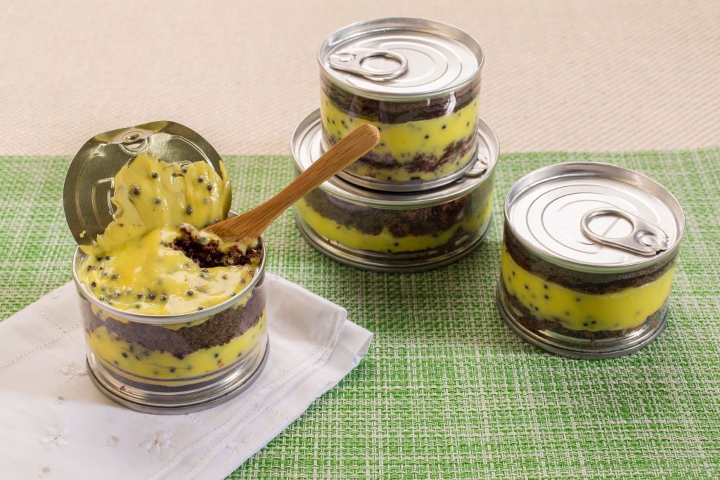 Monte dentro de uma latinha camadas de recheio e de massa, finalizando com o recheio.