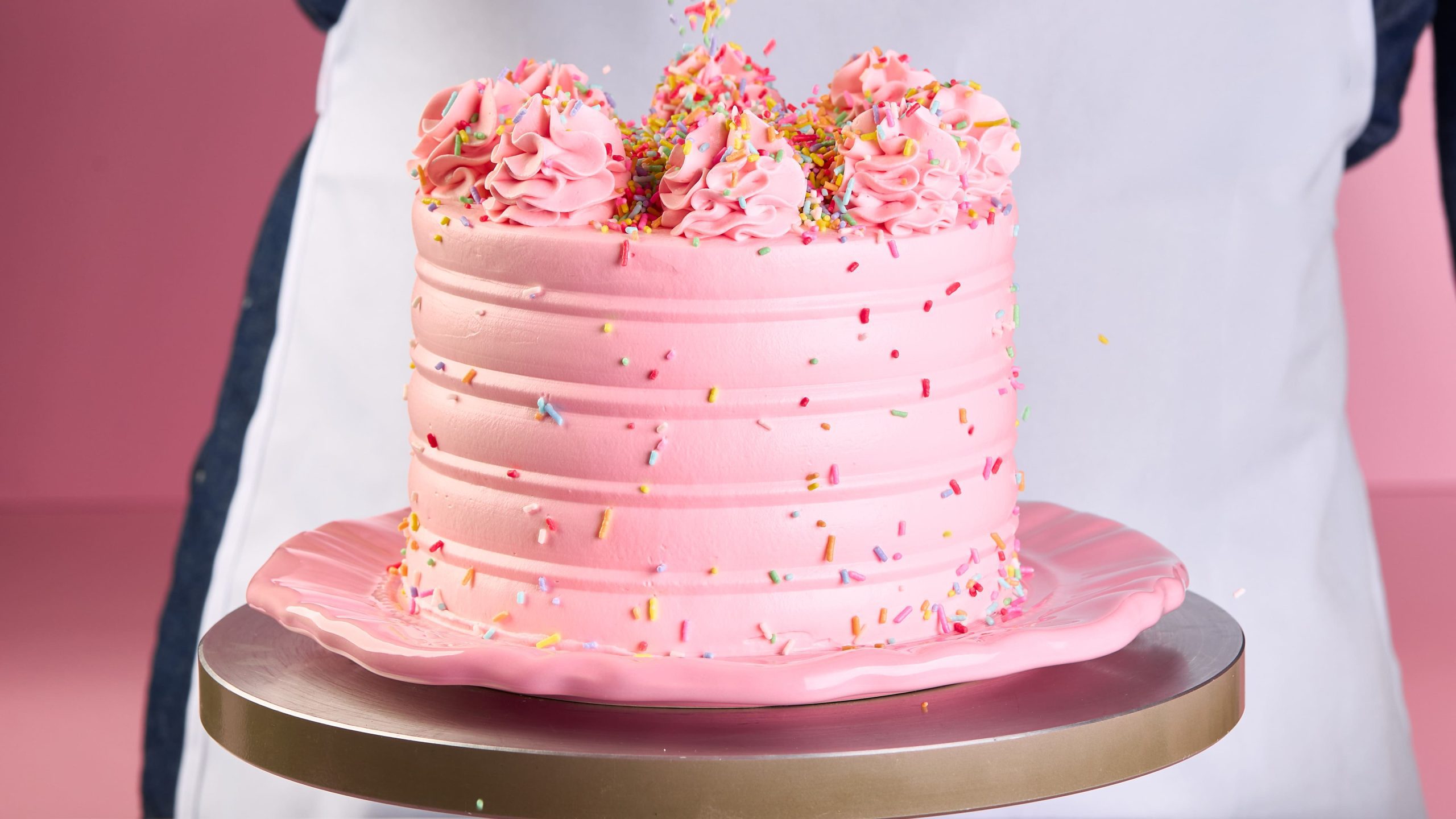 Corte a massa em três partes, forre a forma com um plástico e coloque as camadas de massa molhando-as com a calda e intercalando com a mousse de morango. Em seguida desenforme, cubra com o mousse de morango e faça a decoração com uma espátula, coloque um pouco de mousse em um saco de confeitar com bico 1M e faça as pitangas no topo do bolo, decore com o granulado baby.
