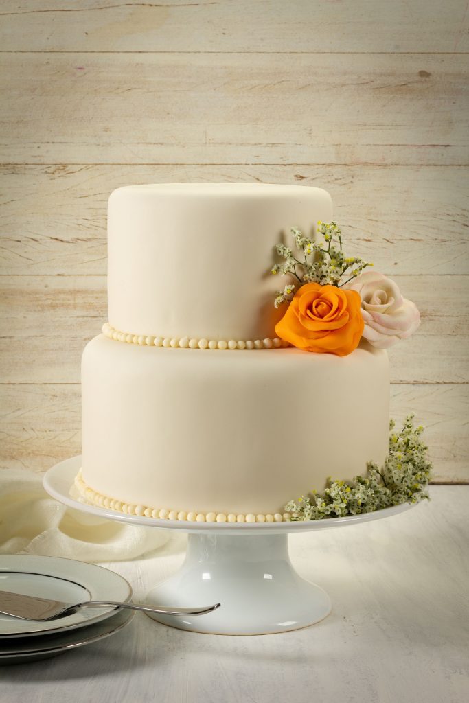 Forre as assadeiras de 15 cm e 20 cm com plástico e intercale camadas finas da massa com o recheio trufado. Leve à geladeira prensados por 6 horas. Retire os bolos da geladeira, deixe sair o gelo por 1 hora e desenforme das assadeiras. Espalhe a blindagem nos bolos e com o auxílio de uma espátula, alise bem. Abra a Pasta Americana com auxílio de um rolo e cubra os bolos. Use um caninho próprio para bolo de andar e coloque o bolo menor sobre o maior. Com o auxílio de um pincel, passe um pouquinho de água em toda lateral do bolo e cole Choco Power Ball. Com a Pasta Americana modele uma rosa branca, depois tinja a Pasta Americana com corante em gel laranja e modele uma rosa laranja. Coloque um macarrão espaguete nas flores e espete-as no bolo. Finalize com flor mosquitinho.