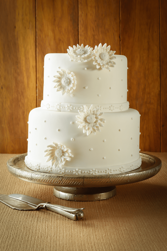 Forre uma assadeira com plástico e intercale camadas finas da massa com o recheio brigadeiro cremoso. Leve à geladeira, prensado por 6 horas. Retire o bolo da geladeira, deixe sair o gelo por 1 hora e desenforme da assadeira. Espalhe a blindagem no bolo e com o auxílio de uma espátula alise bem. Sove a Pasta Americana, abra com o auxílio de um rolo e cubra os bolos. Coloque caninho próprio para bolo de andar e coloque o bolo menor sobre o maior. Bata o Pó para Glacê Real com água seguindo as instruções da embalagem. Coloque em uma manga de confeitar com bico perlê e decore os bolos. Faça o detalhe na lateral com a Pasta Americana, modele flores e cole no bolo com o Glacê Real.