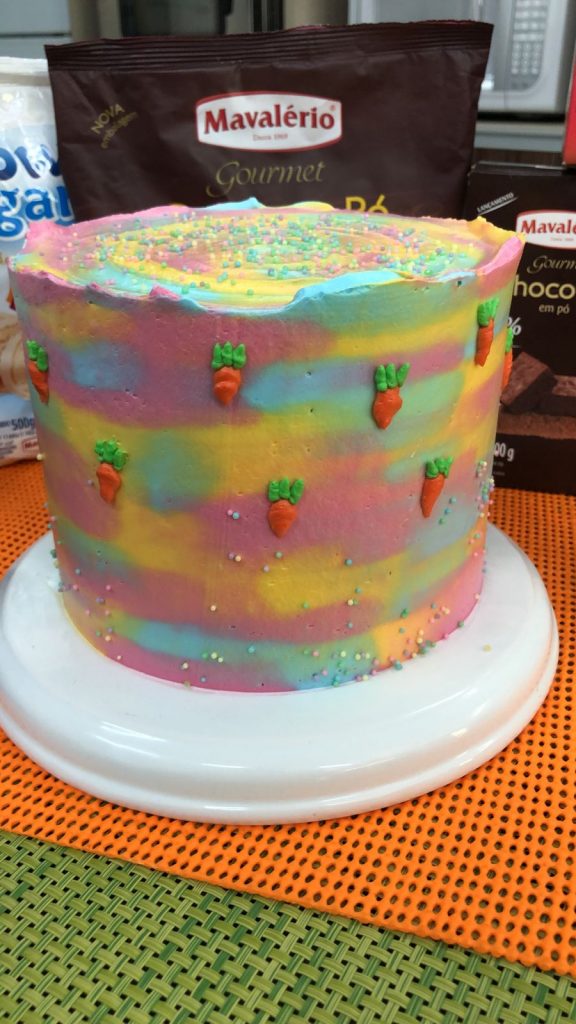 Forre uma assadeira com plástico e intercale fatias de bolo e do recheio, até que fique alto. Divida o chantilly batido em cinco recipientes e tinja com o corante em gel azul, amarelo ouro, rosa, laranja e verde até ficar na cor desejada, reserve. Desenforme o bolo, espalhe o chantilly tingido nas cores azul, amarelo ouro e rosa no bolo, intercalando as cores e alise muito bem com o auxílio de uma espátula. Espalhe a Miçanga Colorida Baby na base do bolo, reserve. Coloque o chantilly tingido de laranja em uma Manga de Confeitar com Bico 5 e pressione na lateral do bolo fazendo uma cenoura. Em seguida coloque o chantilly tingido de verde em uma Manga de Confeitar com Bico 3 e pressione para o detalhe do matinho da cenoura.