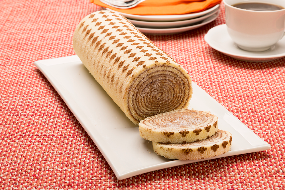 Após assado, coloque o recheio de brigadeiro cremoso e enrole bem. Coloque uma folha de textura vazada em cima do bolo de rolo e polvilhe o Cacau em Pó.