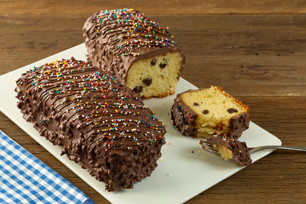 Cobertura Crocante: Em um recipiente, derreta a Cobertura ao Leite em banho-maria ou micro-ondas, acrescente os Flocos de Cereais, misture, banhe o bolo e deixe secar sobre um papel manteiga. Em seguida, faça risquinhos com a Cobertura derretida e decore com as Miçangas Coloridas.