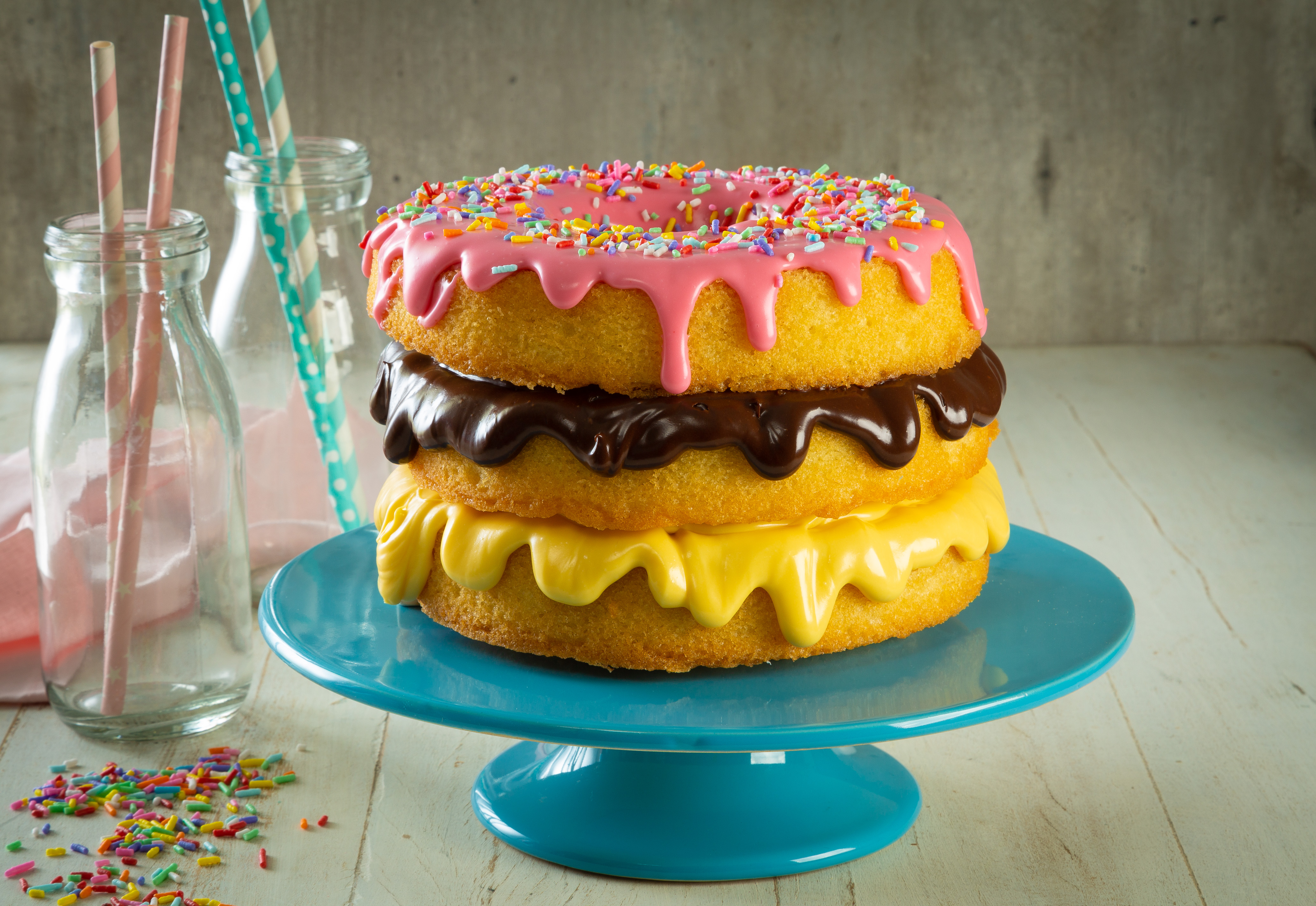 Coloque as coberturas de maracujá, chocolate e morango em mangas de confeitar. Espalhe a primeira cobertura de maracujá no bolo. Coloque o segundo bolo sobre a cobertura de maracujá e espalhe a cobertura de chocolate. Coloque o terceiro bolo sobre a cobertura de chocolate e espalhe a cobertura de morango. Finalize com Granulado Colorido.