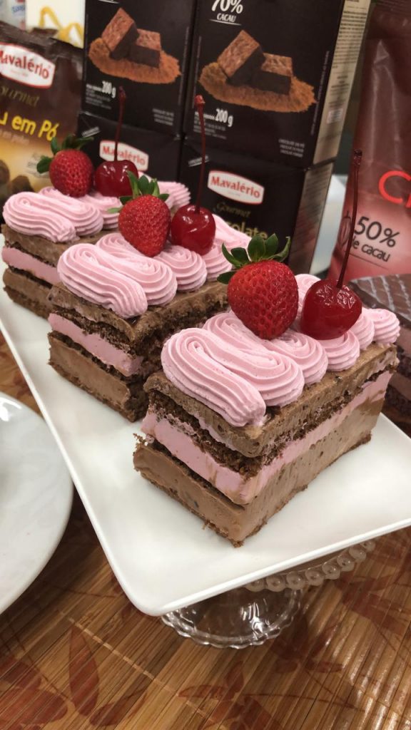 Montagem: Unte um aro quadrado com óleo ou desmoldante. Intercale fatias da massa com o mousse de brigadeiro e o mousse de frutas vermelhas. Leve para gelar.