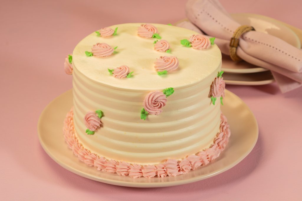 No bowl da batedeira coloque o chantilly gelado e o Pó para Chantifix, misture e bata até ficar no ponto desejado. Desenforme o bolo, cubra com o chantilly batido e passe o Marcador Triângulo. Em seguida tinja o chantilly batido com corante em gel rosa e verde folha até ficar na cor desejada. Coloque em Mangas de Confeitar com os Bico 18, 21, 65 e decore o bolo.