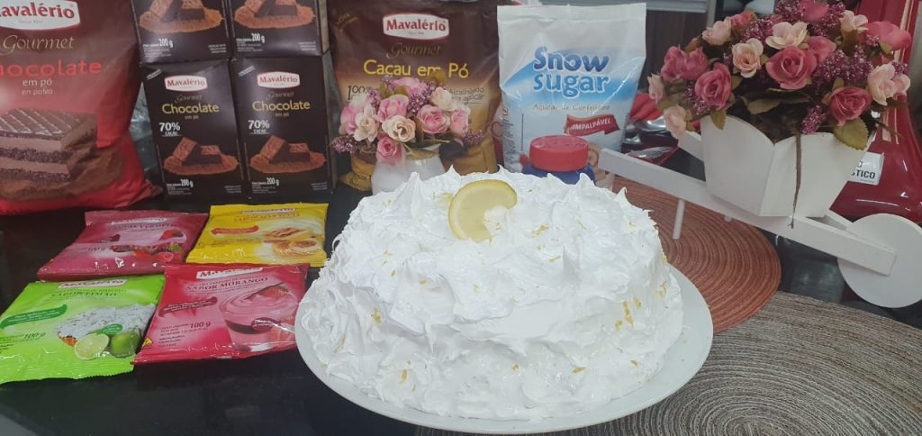 Cobertura Marshmallow: Em uma panela, coloque o Açúcar de Confeiteiro, o açúcar refinado, a clara e o Pó de Limão, misture e leve ao fogo até perder a viscosidade. Em seguida, bata na batedeira até montar.