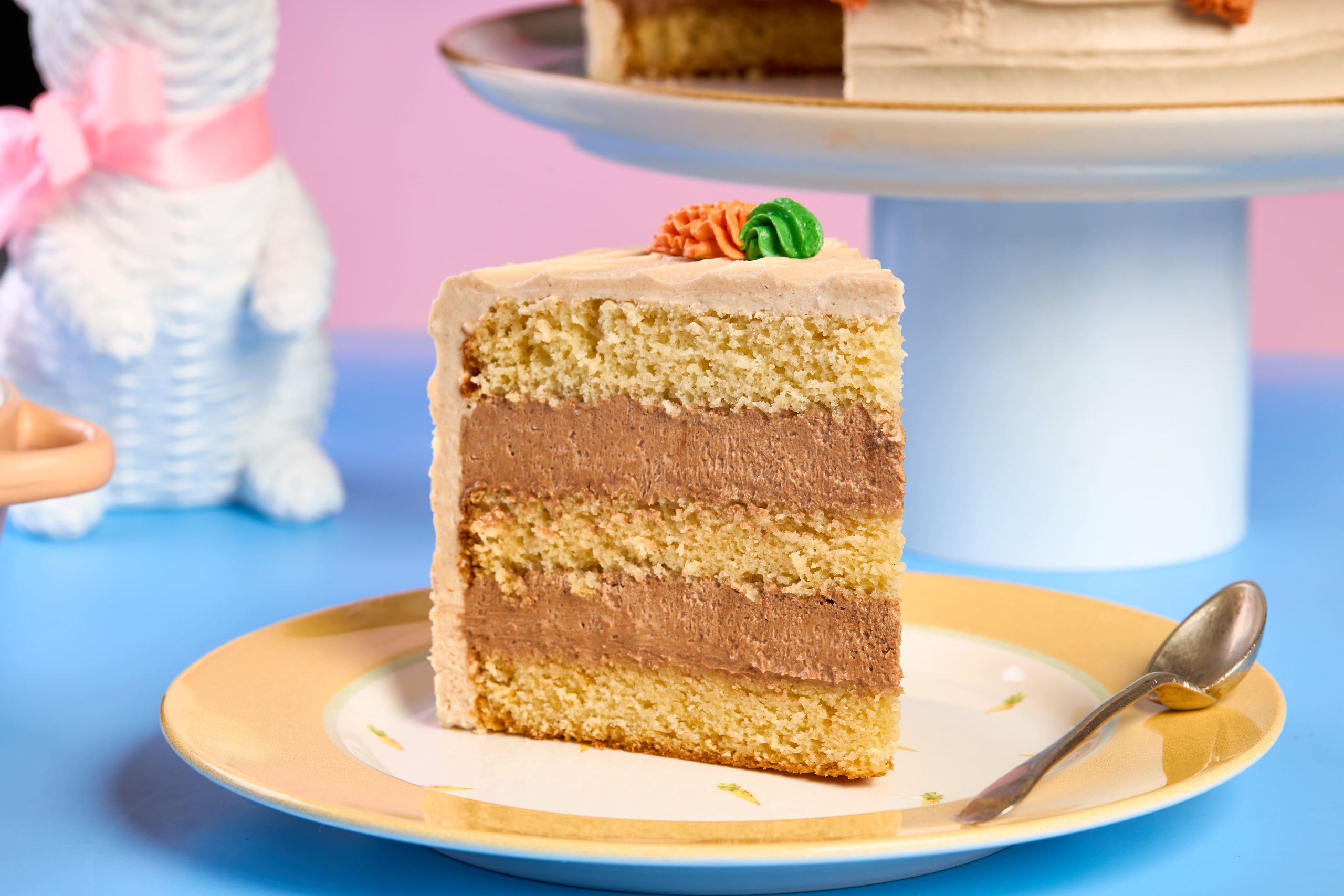 Corte a massa em 3 partes, forre uma assadeira com plástico e intercale fatias de bolo e de mousse de chocolate, lembrando sempre de molhar as fatias de bolo com a calda. Em seguida desenforme o bolo, cubra com o buttercream, usando uma espátula lisa faça um espatulado na lateral e no topo do bolo, separe duas porções de buttercream em recipientes, em um acrescente corante verde e no outro acrescente corante laranja, coloque o buttercream verde em um saco de confeitar com bico perle 3 e o buttercream laranja em saco de confeitar com bico pitanga 5 e faça cenourinhas na lateral e no topo do bolo.