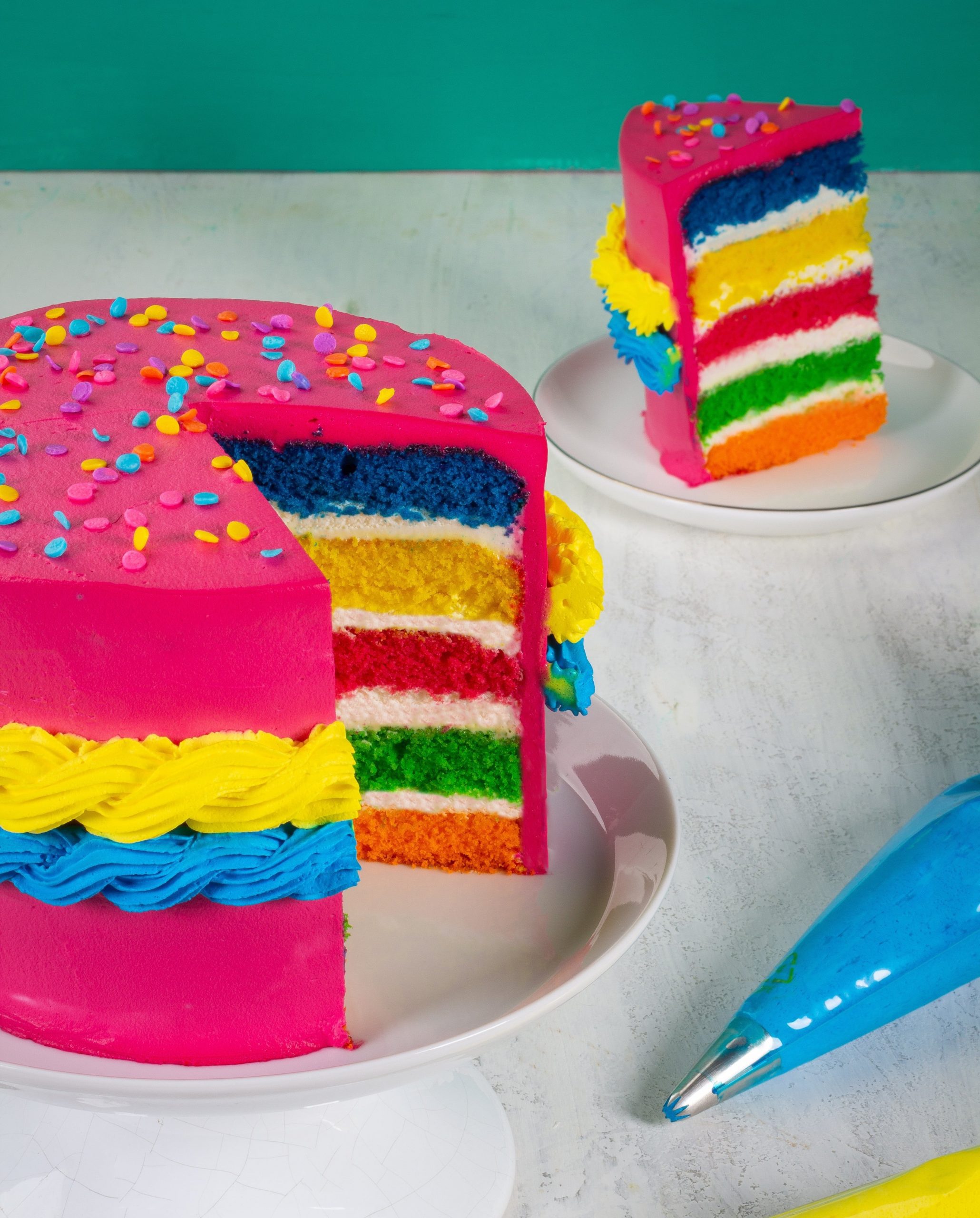 Forre uma assadeira com plástico e intercale as fatias de bolo e do recheio trufado branco, até que fique alto. Desenforme o bolo, cubra com o chantilly tingido de rosado, alisando muito bem com auxílio de uma espátula reta. Coloque o chantilly tingido de amarelo limão e azul real em mangas de confeitar com bico 21 e decore a lateral do bolo. Finalize o topo do bolo com Confeito Confete.