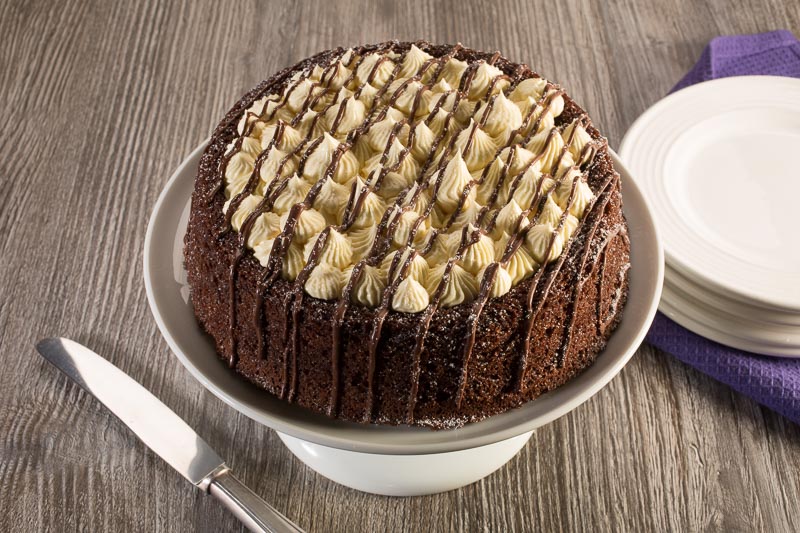 Ganache: Em um recipiente, derreta a Cobertura Meio Amarga em banho-maria ou micro-ondas, acrescente o creme de leite e misture bem. Reserve. Coloque o recheio mousse de maracujá em uma manga de confeitar com um bico pitanga e recheie o bolo. Decore com o ganache fazendo risquinhos e finalize peneirando Açúcar Gelado.