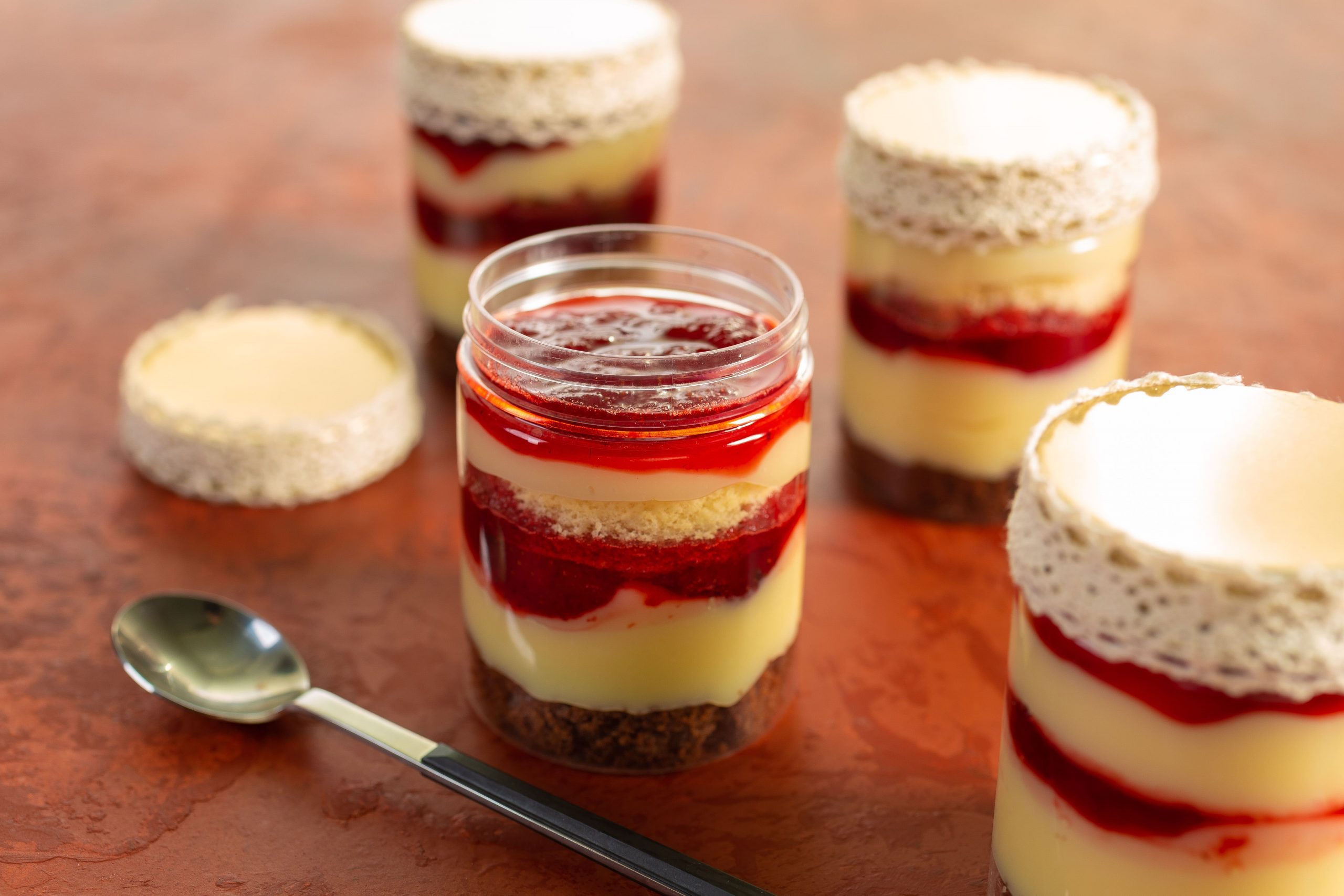 Em potes de sua preferência, intercale camadas da massa de chocolate, do recheio de leite cremoso e da geleia de morango. E da massa branca, do recheio de leite cremoso, finalizando com a geleia.