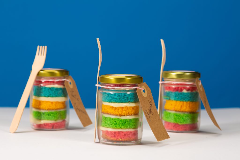 Intercale camadas das fatias coloridas e do recheio de creme branco em potes de sua preferência.
