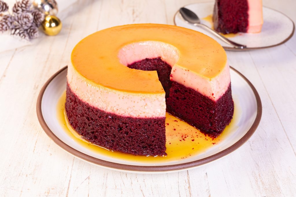 Em uma assadeira de pudim de sua preferência, coloque a calda já fria, o pudim e em seguida, a massa Red Velvet. Leve para assar em banho-maria em forno preaquecido a 180 °C por aproximadamente 45 minutos