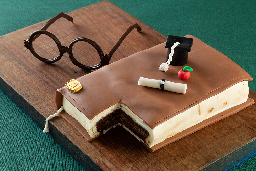 Decoração: Com o auxílio de um rolo, abra a Pasta Americana, cubra o bolo e alise bem a Pasta. Tinja a Pasta Americana com corante em gel marrom, abra com o auxílio de um rolo e modele a capa do livro. Tinja a Pasta com os corantes em gel vermelho, verde, preto e modele uma mini maçã, um mini chapéu capelo e um mini certificado. Enrole um pedaço pequeno de Pasta Americana branca e cole no livro com um pouquinho de água, para o detalhe do marcador de livro. Com o auxílio de uma esteca, faça pontinho em toda lateral do livro.