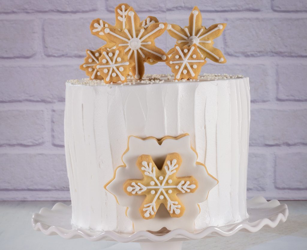 Forre uma assadeira com plástico e intercale fatias de bolo e do recheio creme branco. Desenforme o bolo, cubra com o chantilly batido alisando muito bem. Em seguida passe uma espátula reta de baixo para cima. Bata na batedeira utilizando o batedor raquete o Pó para Glacê Real e a água por 5 minutos. Em seguida coloque o glacê batido em uma manga de confeitar com adaptador e coloque o bico 2 decore alguns biscoitos. Retire o bico 2 e coloque o bico 3 e decore os restantes dos biscoitos. Abra a Pasta Americana com o auxílio de rolo, corte com o cortador de flocos de neve e cole no biscoito com um pouquinho de água. Sobre a pasta cole outro biscoito. Finalize decorando o bolo com os biscoitos.