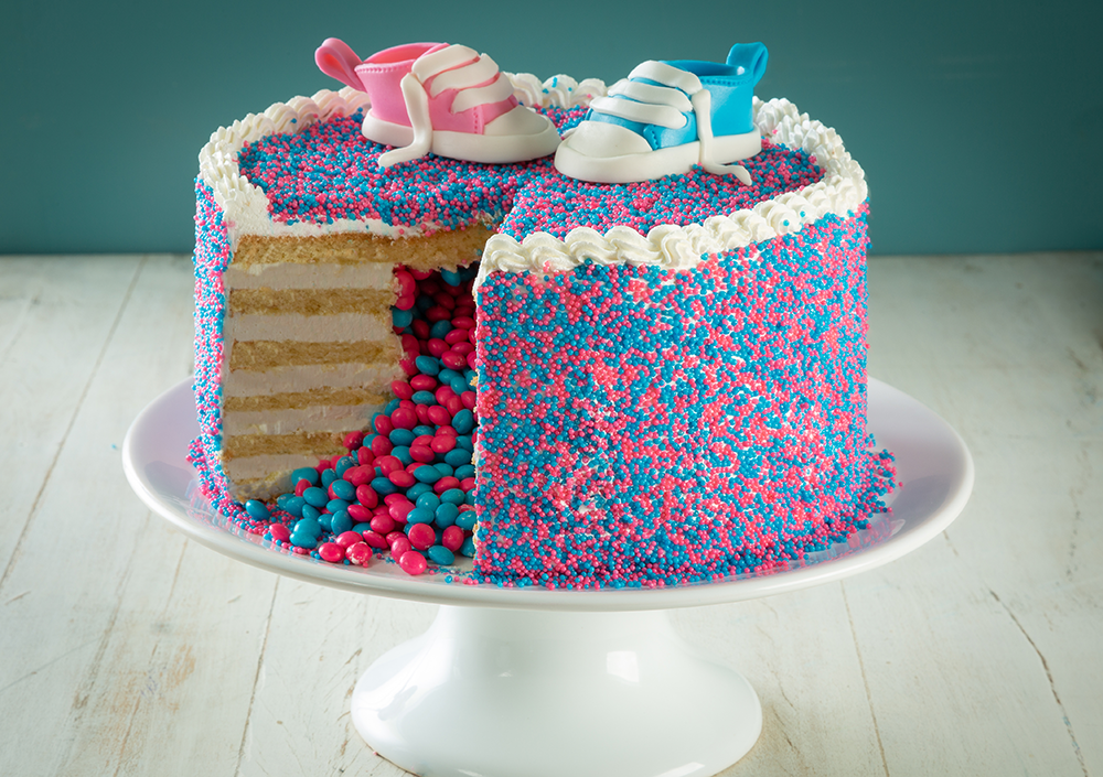 Alise o bolo com chantilly batido. Em seguida, misture as Miçangas Rosa e Azul e passe por todo o bolo. Coloque chantilly em uma manga de confeitar com bico pitanga pequeno e faça detalhes no bolo. Reserve. Tinja a Pasta Americana com os corantes em gel rosa e azul, modele dois sapatinhos e coloque sobre o bolo.