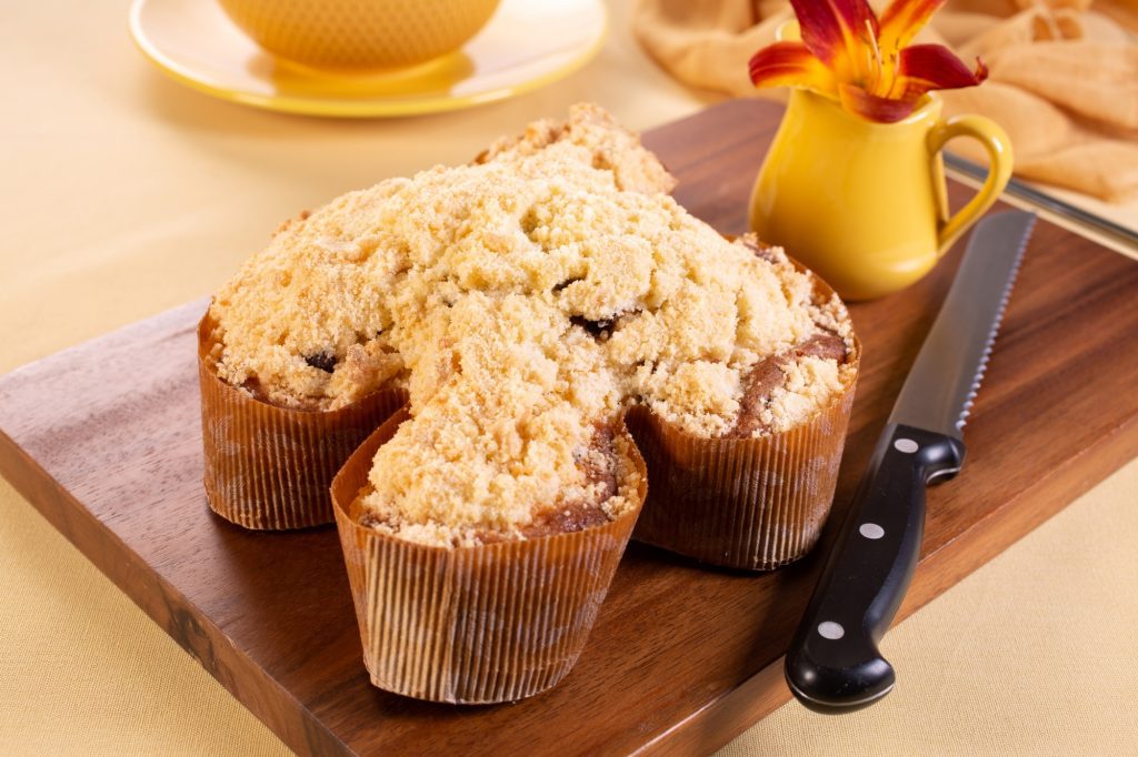 Coloque a massa em formas de papel no formato de colomba, espalhe as Gotas de Chocolate e a farofa. Leve para assar em forno preaquecido a 180 °C por aproximadamente 25 minutos.