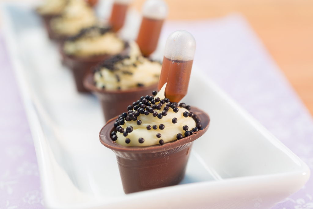 Coloque o recheio cremoso de limão em uma manga de confeitar e recheie as casquinhas. Decore com Miçangas Pretas e finalize com uma ampola com licor de chocolate