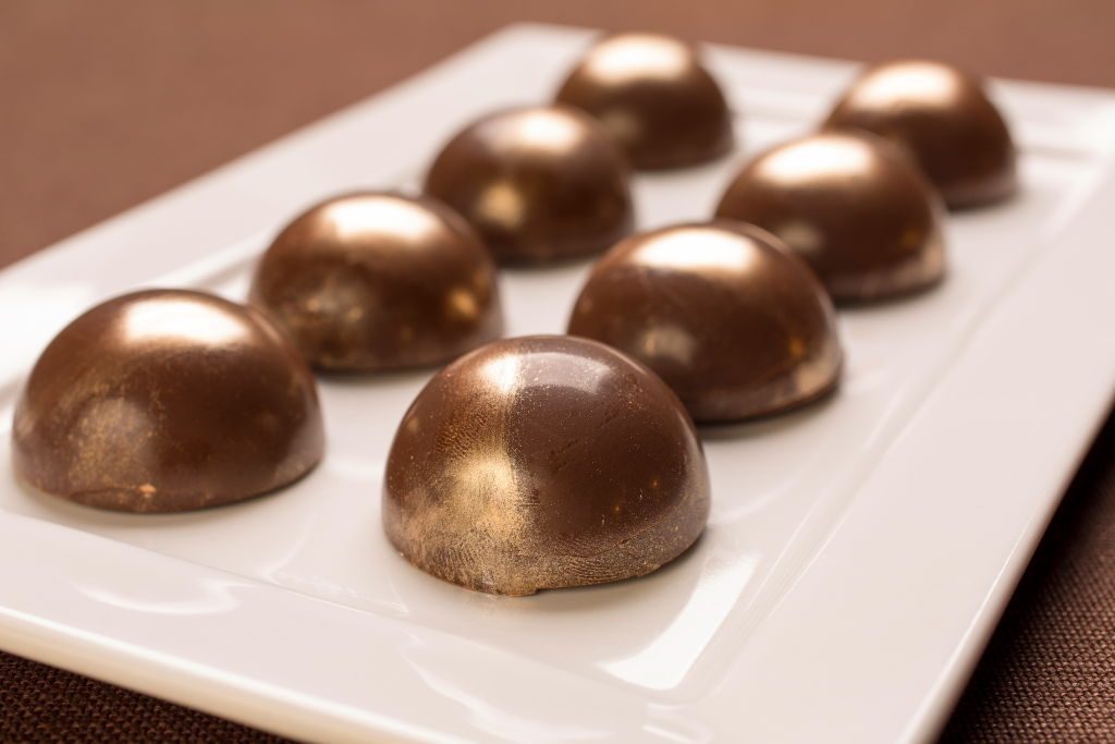 Casquinha: Em um recipiente, derreta a Cobertura Meio Amarga em banho-maria ou micro-ondas. Coloque em forminhas de bombom seguindo as instruções do fabricante. Em seguida, leve à geladeira, até ficar opaca. Em outro recipiente, coloque o creme de avelã e o crocante de açúcar, misture e recheie as casquinhas e feche com a Cobertura derretida. Finalize passando um pincel com o pó dourado na casquinha.