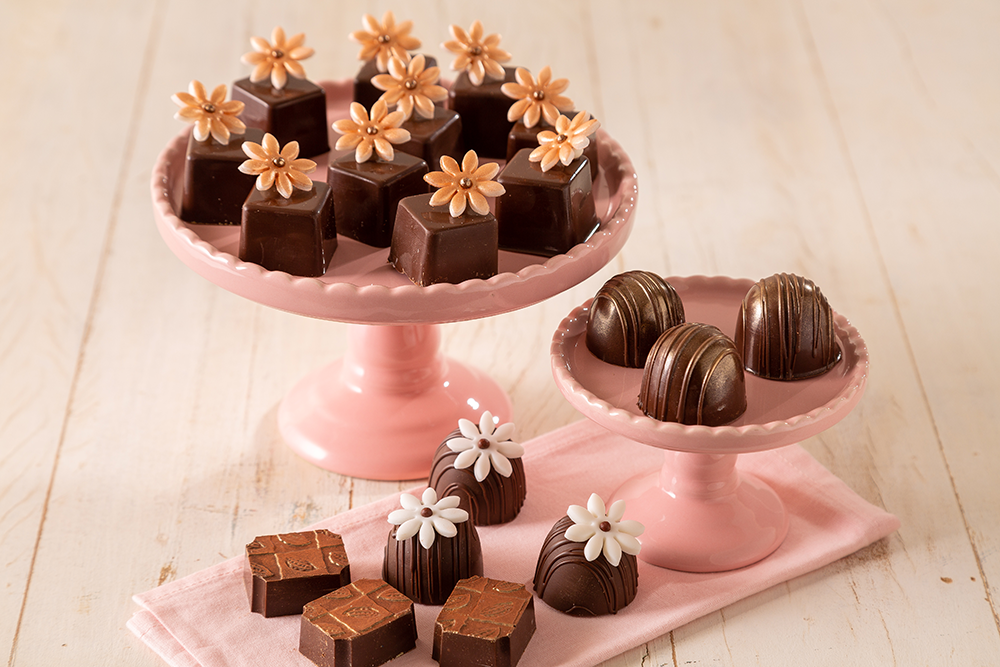 Recheie as casquinhas com o recheio trufado de frutas vermelhas, feche com a Cobertura Blend derretida e reserve. Abra a Pasta Americana com o auxílio de um rolo e modele flores com o cortador. Para o miolo da flor coloque um Choco Power Ball Sabor Chocolate. Para finalizar, com o auxílio de um pincel, passe corante em pó dourado na flor.