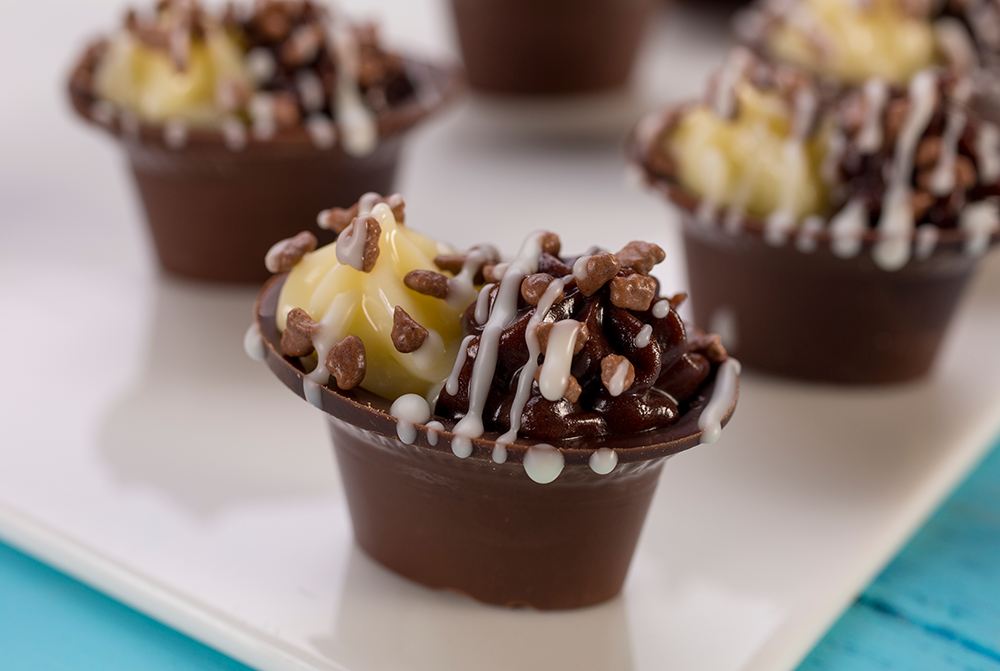 Casquinha: Em um recipiente, derreta a Cobertura Meio Amarga em banho-maria ou micro-ondas. Modele em forminhas de docinho de silicone, seguindo as instruções do fabricante. Leve à geladeira até ficar opaca, retire e reserve.