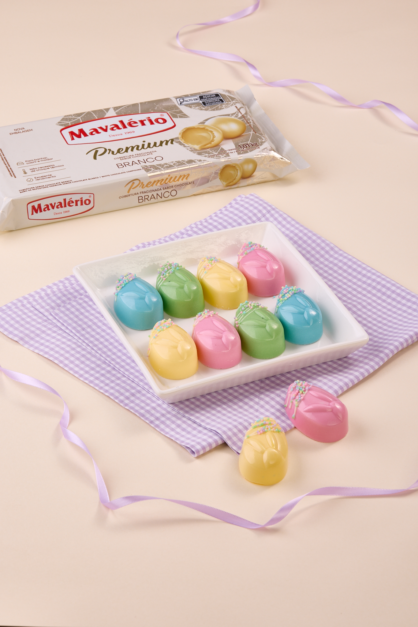 Casca: Coloque a Cobertura Branca em um recipiente e leve para derreter em banho-maria ou micro-ondas, separe em bowls e coloque os corantes de sua preferência, preencha a forma de acordo com as instruções do fabricante e leve à geladeira para cristalizar, retire da geladeira assim que ficar opaco e desenforme os bombons.