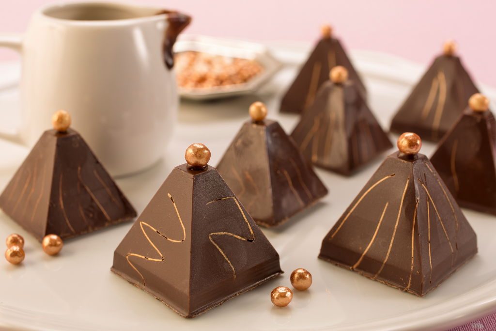 Em um recipiente coloque o Choco Power Ball Branco e o pó dourado, mexa até tingir as bolinhas. Reserve. Preencha a casquinha reservada, metade com a Trufa Meio Amarga e metade com a Trufa de Maracujá, feche a casquinha com a Cobertura derretida. Coloque um pouquinho de Cobertura no topo da pirâmide e cole um Choco Power Ball.