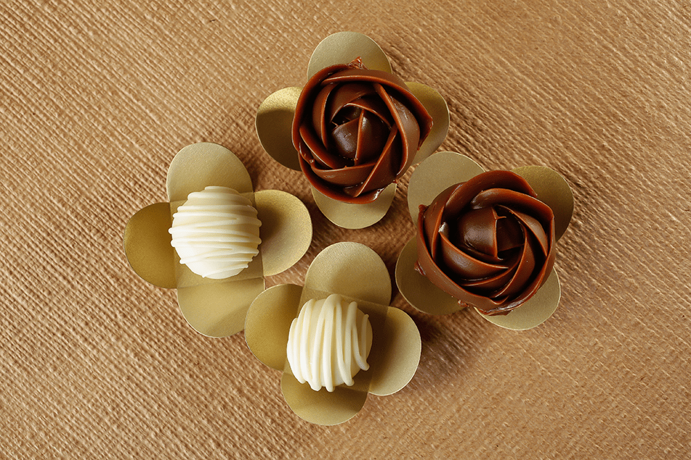 Decoração Flor de Brigadeiro: Em uma panela, coloque o leite condensado, o creme de leite e a Cobertura Blend. Leve ao fogo, mexendo sempre até ficar cremoso, quase no ponto de enrolar. Deixe esfriar, coloque em uma manga de confeitar com bico pétala pequeno e faça rosa nos bombons.