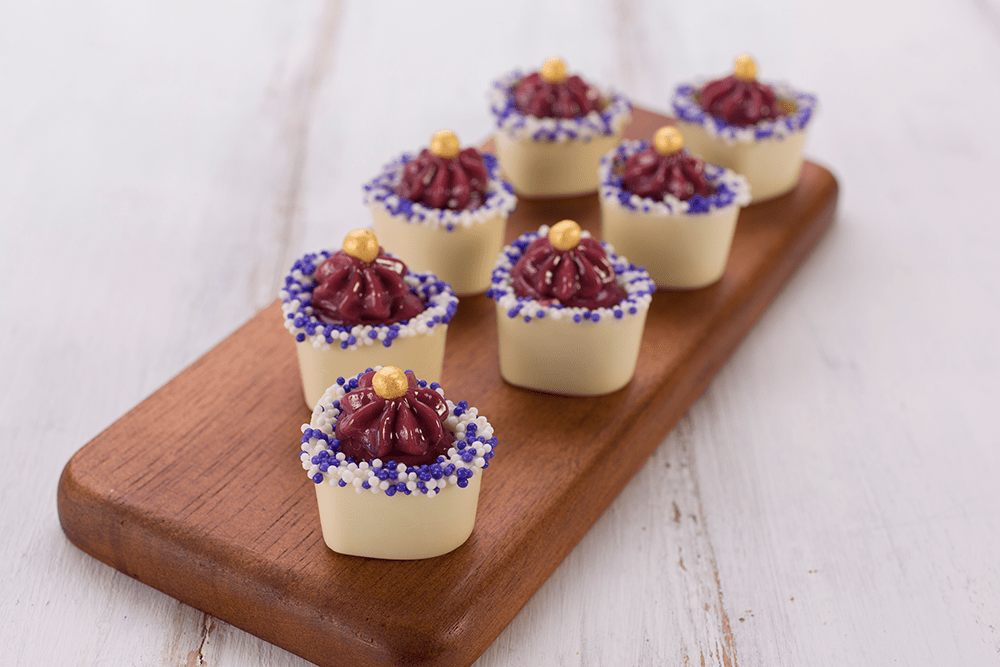 Mergulhe a borda da caixinha na Cobertura Branca derretida em banho-maria ou micro-ondas e passe nas Miçangas Branca e Lilás. Deixe secar e coloque o recheio com o auxílio de uma manga de confeitar e um bico pitanga pequeno. Por último decore com um Choco Power Ball Branco tingido no corante em pó dourado.