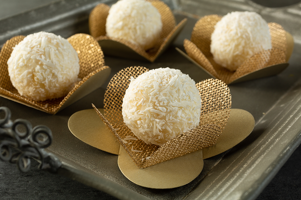 Para banhar e decorar: Depois de frio modele bolinhas, reserve. Em um recipiente, derreta a Cobertura em banho-maria ou micro-ondas. Passe um pouco de Cobertura derretida na palma da mão, boleie o docinho e em seguida passe no coco ralado.