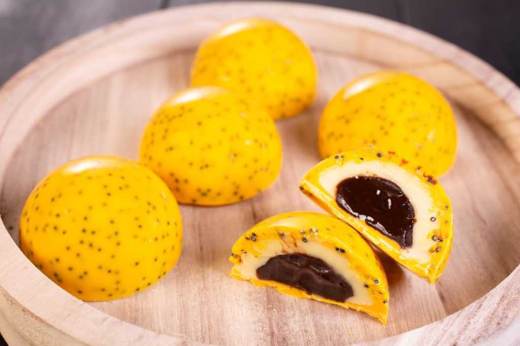 Coloque o recheio trufado de maracujá e o recheio trufado amargo em Mangas de Confeitar. Recheie as casquinhas com o recheio trufado de maracujá e em seguida, com o recheio trufado amargo. Feche com a Cobertura derretida.