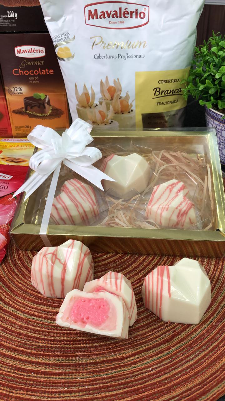 Com as casquinhas reservadas, volte para base da forminha, recheie com a trufa de cereja com aproximadamente dois terços da forma, com auxílio de uma Manga de Confeitar da Wilton e Bico 12, finalize com creme de morango, com auxílio de uma Manga de Confeitar Wilton e Bico 12, coloque no centro do bombom pressione para finalizar. Feche com a Cobertura derretida.